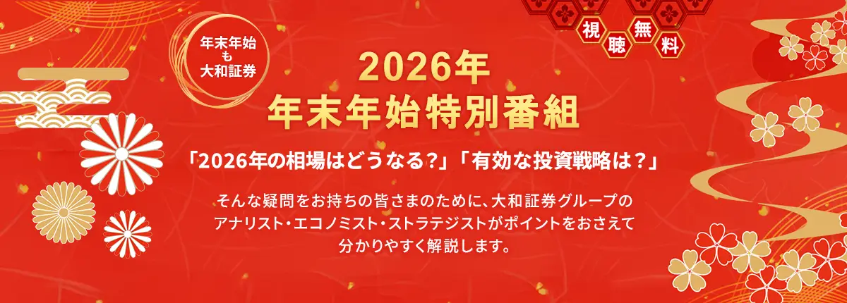 また、各商品等には価格の変動等による損失が生じるおそれがあります。商品ごとに手数料等およびリスクは異なりますので、当該商品等の上場有価証券等書面または契約締結前交付書面、目論見書、お客さま向け資料等をお読みください。
