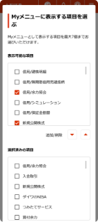 「Myメニュー」と「マーケット情報」は、変更内容を端末ごとにCookieで保存する仕様となっているため、変更内容は反映されません(機種変更等で利用環境が変更された場合も設定は引き継がれません)。