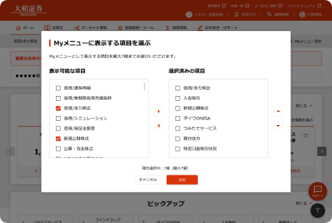 よく使うメニューだけを設置できるように「Myメニュー設定」を新設。また、すぐに知りたいマーケット情報を選択して表示するなど、ひとりひとりのお客さまが、ご自身の使い方に合わせ、トップ画面のレイアウトをカスタマイズできるようになります。