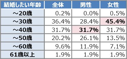男性は40歳までに、女性は30歳までに結婚したい人が多い、ということですが、平均初婚年齢※2(男性31.1歳、女性29.4歳)からすると、Aくんのような未婚の30代男性は少しのんびり構えているようです。また、「結婚したい」というお互いのニーズがマッチする、という意味*では、Aくんにとっては、20代後半の女性と知り合う機会を増やすことが結婚への近道かも知れません。