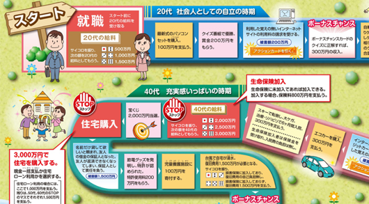 だからと言って、ライフプランセミナーで「まず、みんなで人生ゲームをやりましょう!」という訳にはいかないので、色々と探してみたところ、とても良い教材を見つけました。第一生命が開発した『ライフサイクルゲームⅡ~生涯設計のススメ~』というスゴロク形式の消費者教育教材※1です。