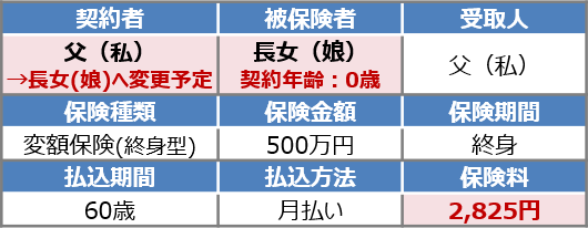 簡単に言えば、娘が0歳のときに契約した終身保険です。娘が亡くなったときに備えて、という話しではありません。契約当初から、娘が社会人になったら契約者、つまり、保険料の負担者を私から娘に変更しようと思っていたのです。