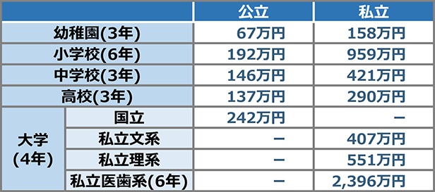 そして、20代の皆さまにライフプランニングを自分事として考えてもらうための格好の題材が「教育費」です。これは住宅費と老後の生活費とともに「人生の3大支出」とも言われますが、20代の皆さまにとっては、自分自身が関係した支出として、一番具体的にイメージしやすいのが「教育費」だと思うからです。例えば、20代向けのセミナーや新入社員向けの研修では、下のような表を紹介することがよくあります。参加者の皆さんが、生まれてから高校や大学を卒業するまで、どれくらいのお金がかかったことになるのか、ざっくりではありますが、実際にイメージしてもらうのです。