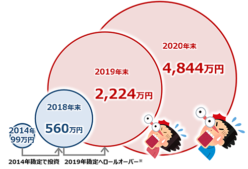 このメリットを端的に示すのが、ご覧いただいている一般NISAの投資実例のイメージ図。2014年に99万円で購入した株式が5年後には560万円になり、翌年末に2,224万円、さらに翌年、2020年末には4,844万円になっているのです。このタイミングで売却すれば、税金は約1,000万円。これが非課税になるのですから、その魅力たるや、説明不要ですね(笑)。