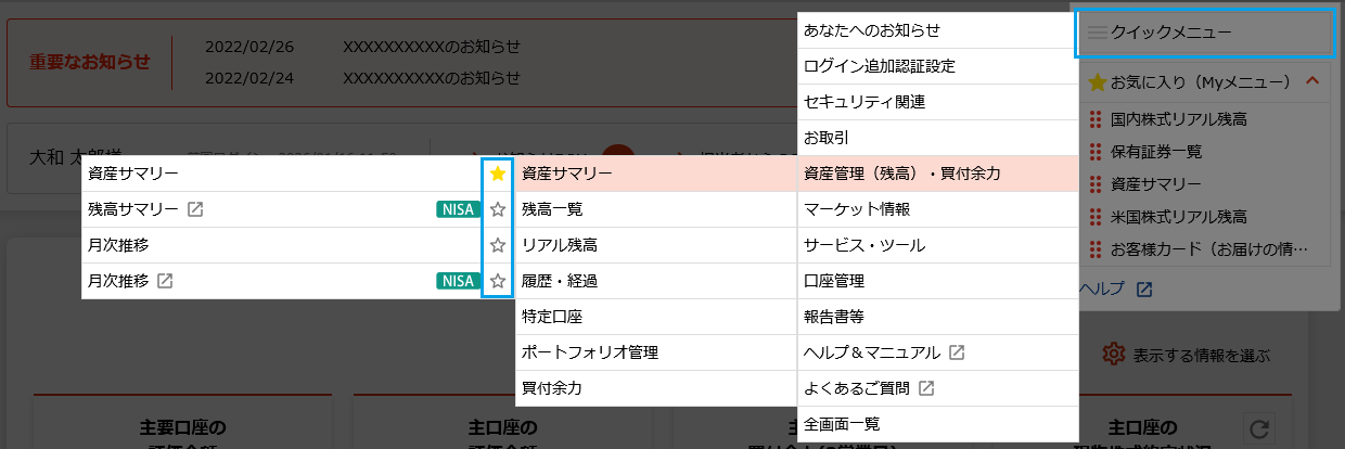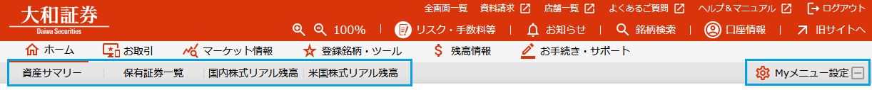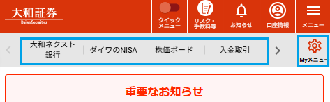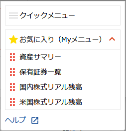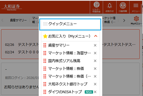 オンライントレードの各画面(一部対象外あり)からアクセスできるMyメニューを提供しています。