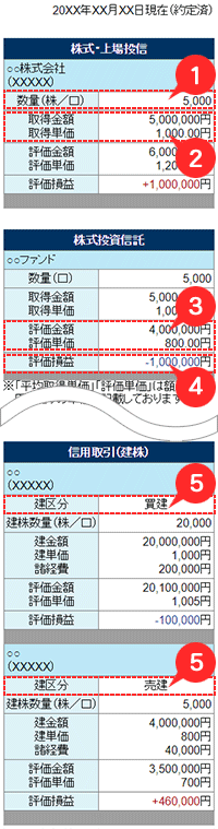 「株式・上場投信」「信用取引(建株)」については、保有銘柄が株式分割、株式併合を実施した場合、権利落ち日または権利落ち日から数日の間は「評価単価」「評価金額」「評価損益」を「-」で表示します。