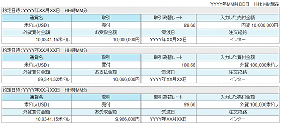 ・約定日の翌3時まで表示されます。それ以降は、残高/履歴メニューの取引履歴画面、または郵送もしくは電子交付される取引報告書をご確認ください。