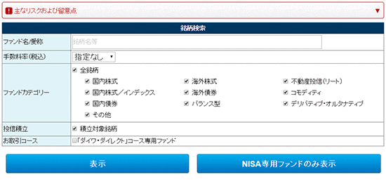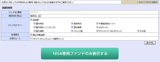 ・「NISA専用ファンドのみ表示」ボタンを押すとNISA専用ファンドのみが一覧で表示されます。「NISA専用ファンドのみ表示」ボタンを押した時は、ファンド名/愛称、手数料率、ファンドカテゴリーの検索条件は無視されます。