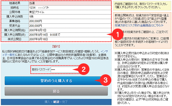 例.「当選」となった「○○○ソフト」株式の購入申込を行う場合