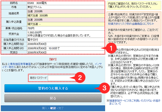 例.「当選」となった「×××電気」株式の購入申込を行う場合
