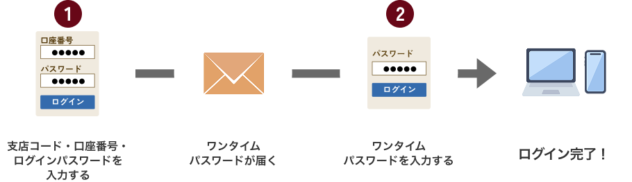 オンライントレードへのログインには①お客さまに設定いただくログインパスワード※1と②ログイン毎に発行される使い捨てのパスワード(ワンタイムパスワード)※2の2種類のパスワードが必要です。