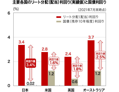 また、Jリートは主要各国の中でリートと国債の利回り格差が相対的に大きいことも投資魅力のひとつといえます。