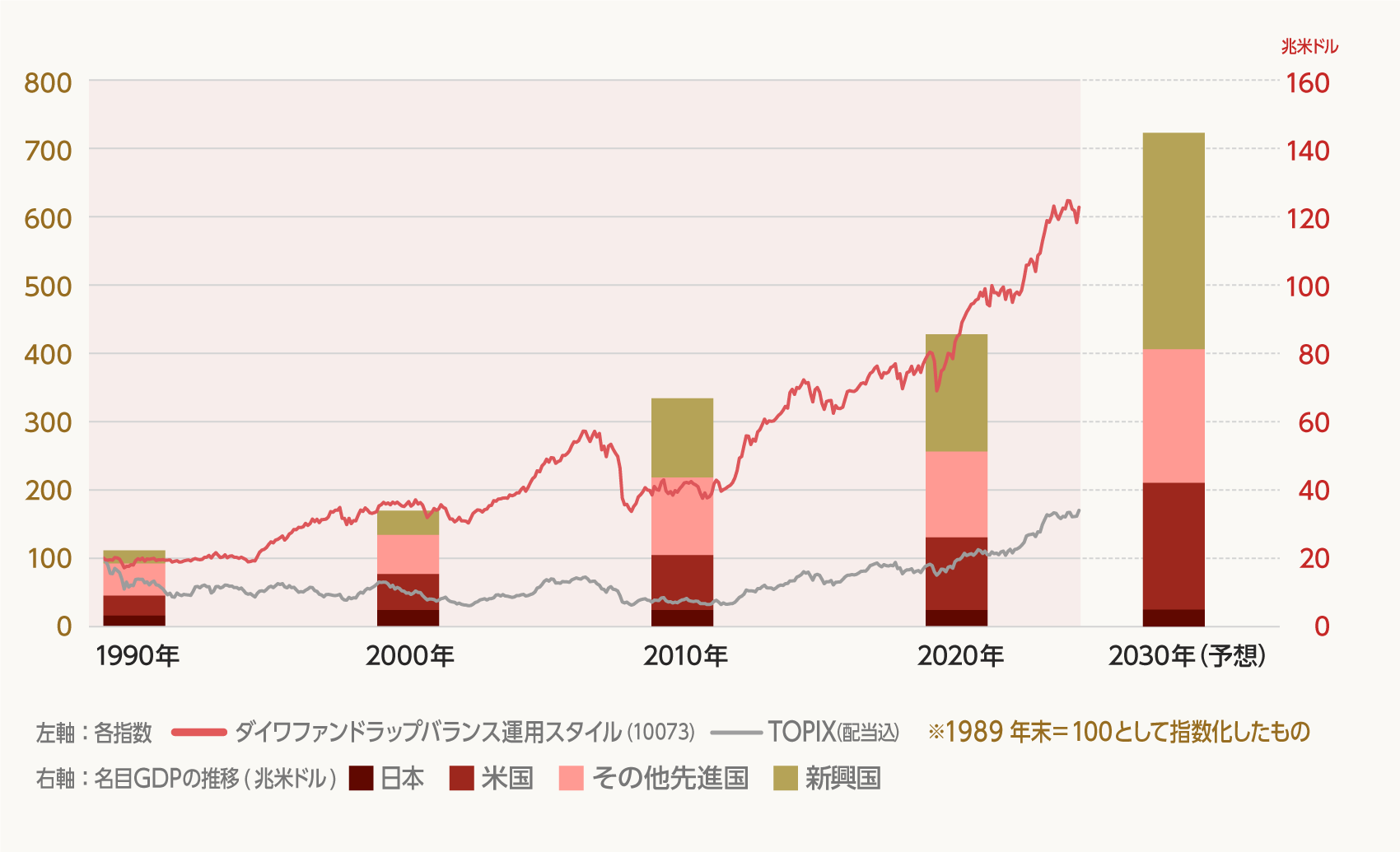 当ページにおいて使用するインデックスは、次の通りです。日本株式:TOPIX(配当込)、外国株式:MSCIオールカントリー(除く日本)、日本債券:ダイワ・ボンド・インデックス(総合)、外国債券:FTSE世界国債インデックス(除く日本)、J-REIT:東証REIT指数(配当込)、外国REIT:S&P先進国REIT指数(除く日本、配当込)、コモディティ:S&P GSコモディティ指数(配当込)。(出所)Bloomberg、Factset、IMF「世界経済見通し(2025年4月)<GDP、現在の価値>」より大和証券作成。2030年の名目GDPは、IMFの予測です。
