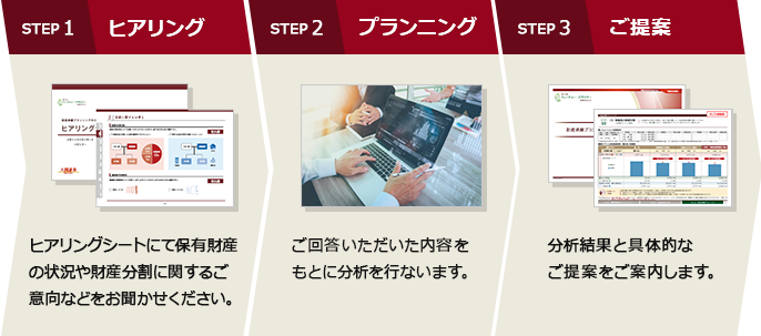 「財産承継プランニング」は、ヒアリングシートにてお伺いした“ご家族のプロフィール”や“財産に関するお考え”および“保有財産の状況”などをもとに、さまざまな角度から分析を行ない、その分析結果とともにお客さまのご意向に沿った財産承継プランをご提案させていただくサービスです。