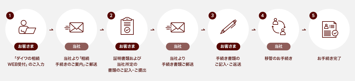 必要な証明書類や当社所定の書類を確認後、お亡くなりになられたお客さまの口座でお預かりしておりますご資産を移管するお手続きを行ないます。当社における移管のお手続きは、通常、3日~2週間程度を要します。
