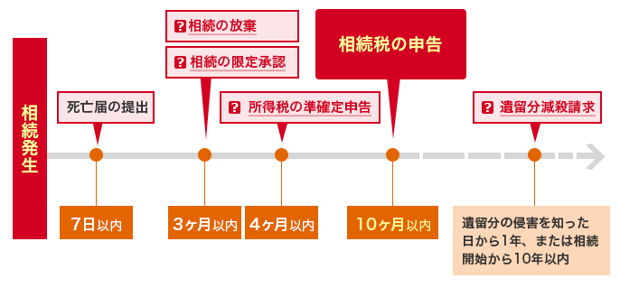 相続とともに生じる死亡届の提出や相続財産を放棄する場合の家庭裁判所での手続き、また亡くなった人の収入に対する所得税の申告にはそれぞれ期限が決まっています。