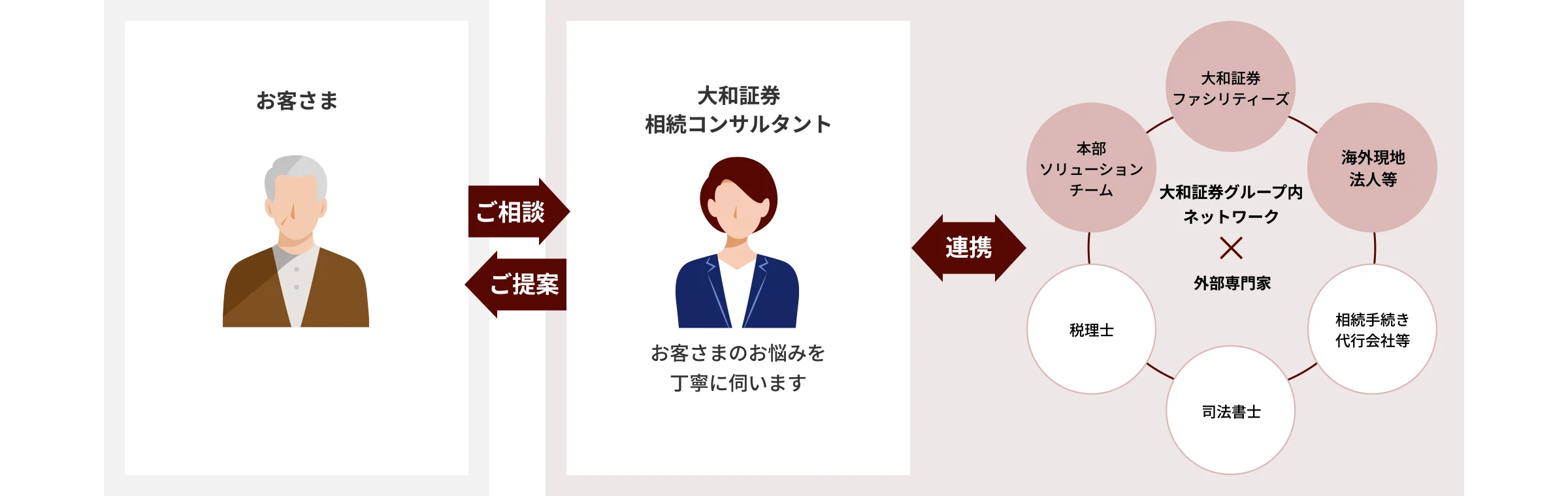 今の時代、ご家族が遠方にお住まいということも少なくありません。全国の本・支店に在籍する相続コンサルタントがグループ内ネットワークや外部専門家と連携しスムーズなお手続きをサポートいたします。