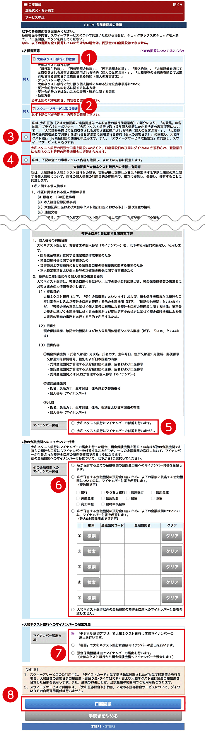 「預貯金口座付番に関する同意事項等」の内容をご確認いただき、大和ネクスト銀行へのマイナンバー付番を行なうかどうかをご選択ください。
